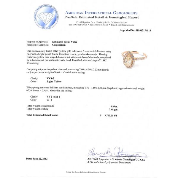 14KT Yellow Gold 0.89ctw Diamond Unity Ring A4071. Excellent Condition! UX6051SY. One electronically tested 14KT yellow gold ladies cast & assembled diamond unity ring with a bright polish finish. Condition is new, good workmanship. The ring features a yellow pear shaped diamond set within a ribbon of diamonds, completed by a diamond set two millimeter wide band. Identified with markings of "14K". Containing: One prong set round brilliant cut diamonds, measuring 7.60 - 4.00 x 2.52mm (depth est.) approximate weight of 0.44ct. Graded in the setting. Clarity: VVS-2. Color: Light Yellow. Thirty prong set round brilliant cut diamonds, measuring 1.70 - 1.50 x 0.96mm (Depth est.) approximate total weight of 30 Stones = 0.45ct. Graded in the setting. Clarity: VS-2 to SI-2 to SI-1. Total Weigh of Diamonds: 0.89ct. Total Weight of Ring: 2.68gm. AIG appraised at $3,760.00.
