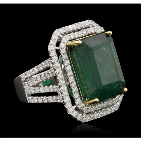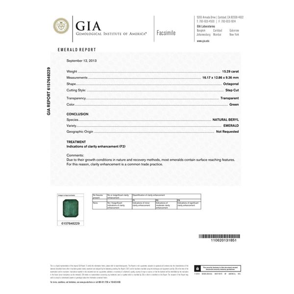 14KT White Gold 15.29ct GIA Certified Emerald and Diamond Ring A5886. Great Condition. WW3056DJ. One electronically tested 14KT white gold ladies cast emerald and diamond ring. Condition is new, good workmanship. The featured emerald is set within a two tiered diamond lattice gallery, supported by diamond set three-way split shoulders and completed by a four millimeter wide band. Bright polish finish with yellow gold accented prongs. Identified with markings of "14K". Containing: One prong set rectangular step cut natural emerald, measuring 16.17 x 12.86 x 9.36mm, exact weight 15.29ct., clarity is heavily included, type III, medium dark, moderately strong, very slightly bluish green color, (GIA vslbG 6/4), cut is good. Transmitting light with a minimum of distortion, transparent. Naturally occurring internal & external characteristics are present. Indications of oil, & opticon residue. Colored Stone Grading Report attached. Graded loose prior to setting in the GIA Laboratory, Report # 6157648229. One hundred sixty prong set round brilliant cut diamonds, measuring 1.40 - 1.40 x 0.84mm (depth est.) approximate total weight of 160 Stones = 1.79ct. Graded in the setting. Clarity SI-2 to 1-2. Color F - H. Total Weight of Colored Stones 15.29ct. Total Weight of Diamonds 1.79ct. Total Weight of Ring 13.30gm. AIG Appraised at $49,100.00.